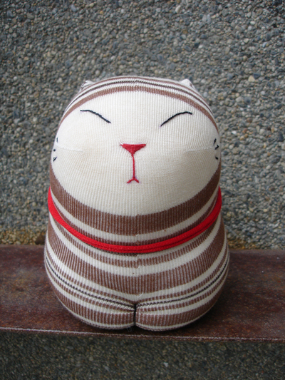 原本要作成招財貓 可能棉花抓太多了 一下子,就很有形 手也不用作了,表情也很傳神(很像這位可愛的學生喔) 只要一條尾巴就行了 襪子本身是咖啡色條紋花 成品看起來很有復古位喔 很難得的作品 這位學員是學設計的喔(難怪感覺很對)
